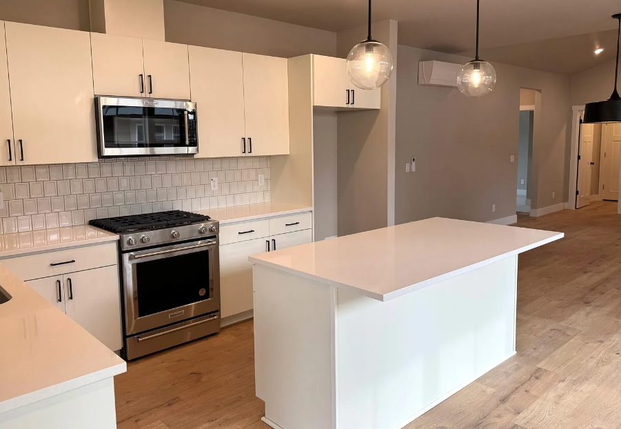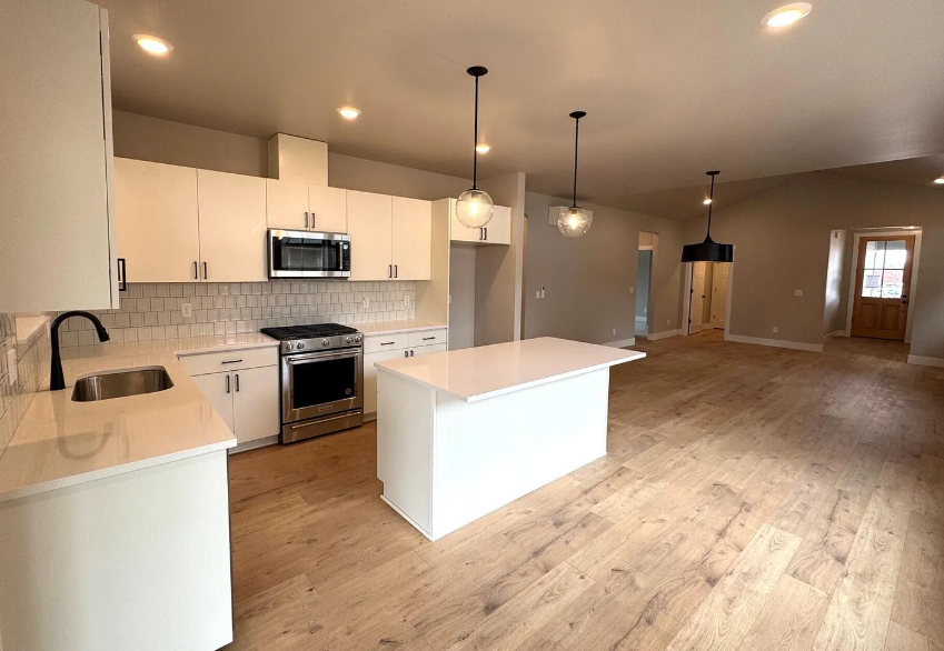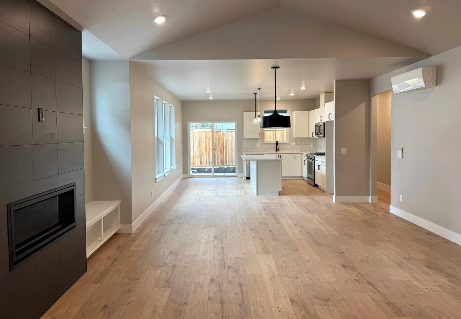This adorable, single level home features a bright kitchen and dining area, great room with a gas fireplace, primary bedroom suite, 2 additional bedrooms, full bath+ utility/ mud room. The kitchen features solid surface counters, tile backsplash, quartz island and stainless-steel appliances. Durable, modern, laminate floors throughout the main living area, bathrooms and utility room. Bathrooms feature solid surface counters and backslash. Primary has dual vanity; tile shower & walk in closet. Sliding doors lead to a covered patio for convenient outdoor living space. Ductless heating system provides heating & cooling comfort year-round.