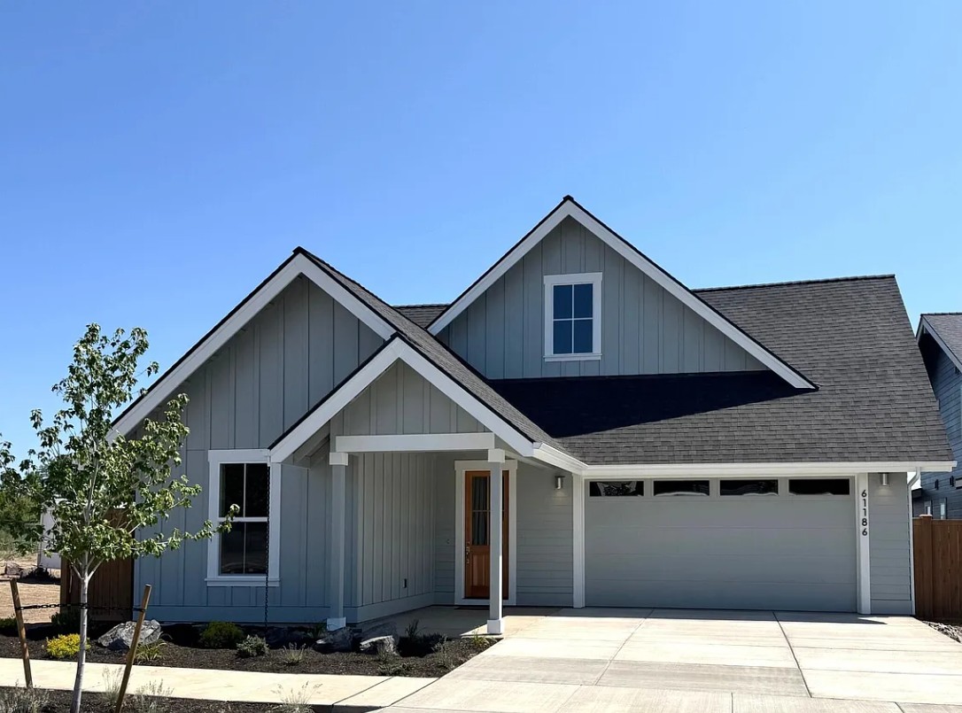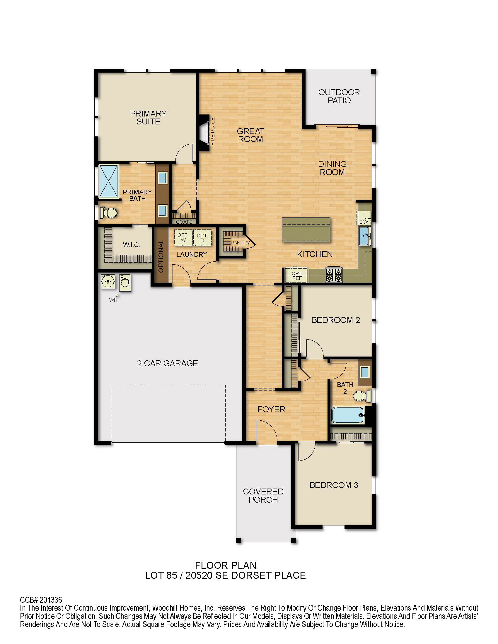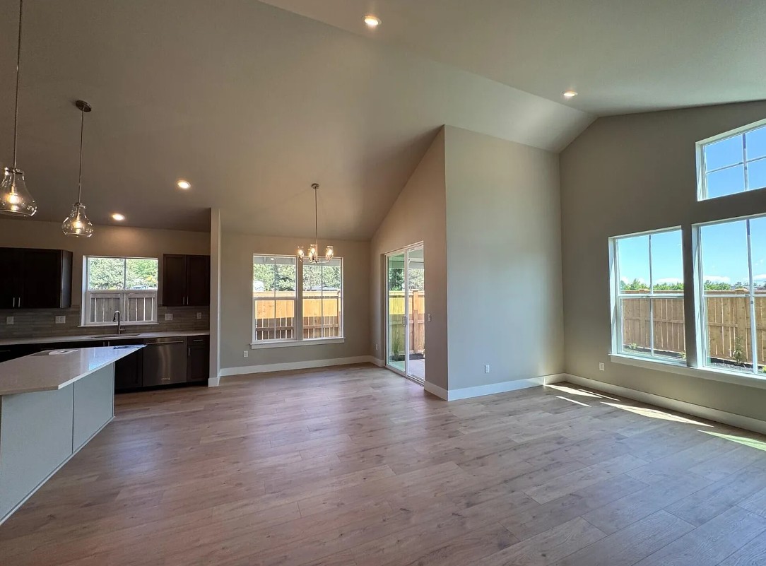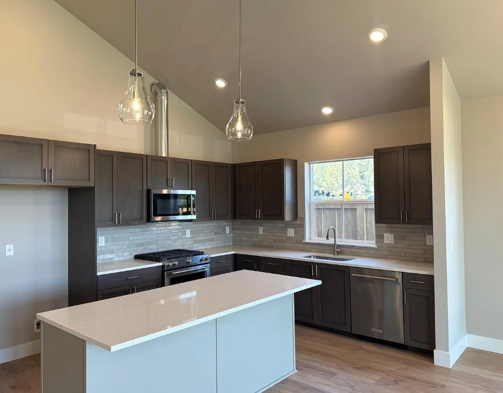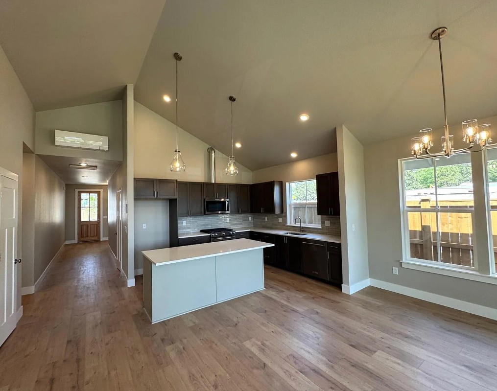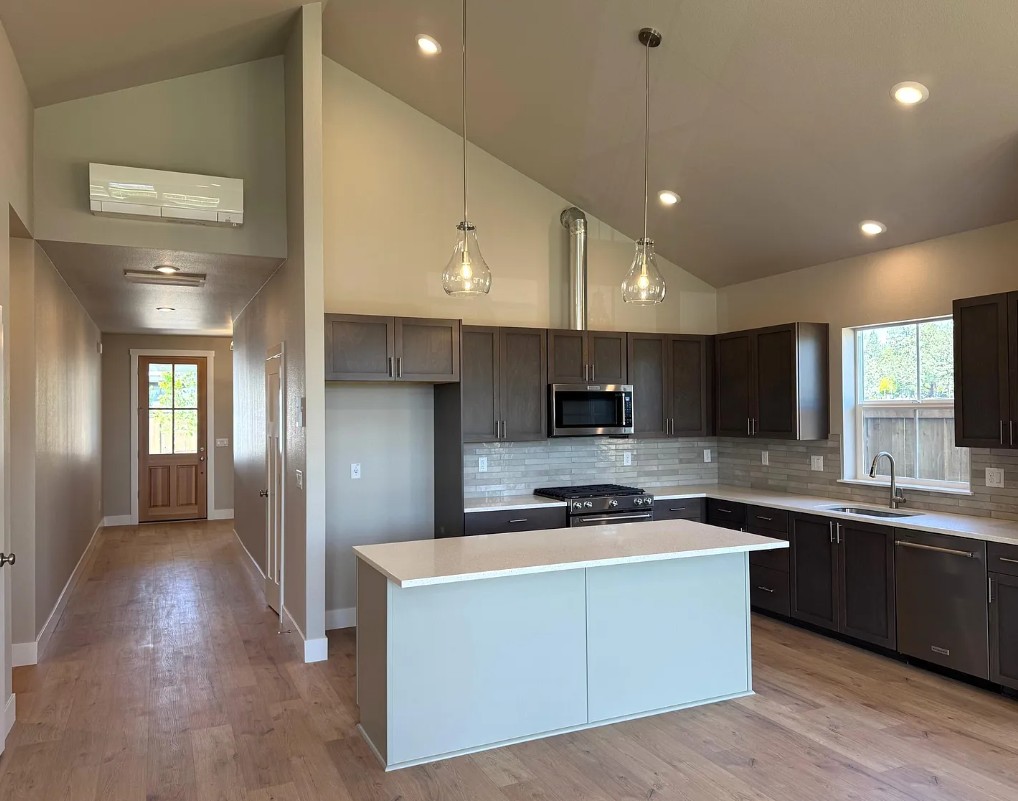 This light and bright single level home features a large kitchen and dining area, great room with a gas fireplace, primary bedroom suite, 2 additional bedrooms, full bath + utility/mud room. The kitchen features solid surface counters, tile backsplash, quartz island and stainless-steel appliances. Durable, modern, laminate floors throughout the main living area, bathrooms and utility room. Bathrooms feature solid surface counters and backsplash. Primary has dual vanity; tile shower & walk in closet. Sliding doors lead to a covered patio for convenient outdoor living space. A Ductless heating system provides heating & cooling comfort year-round.