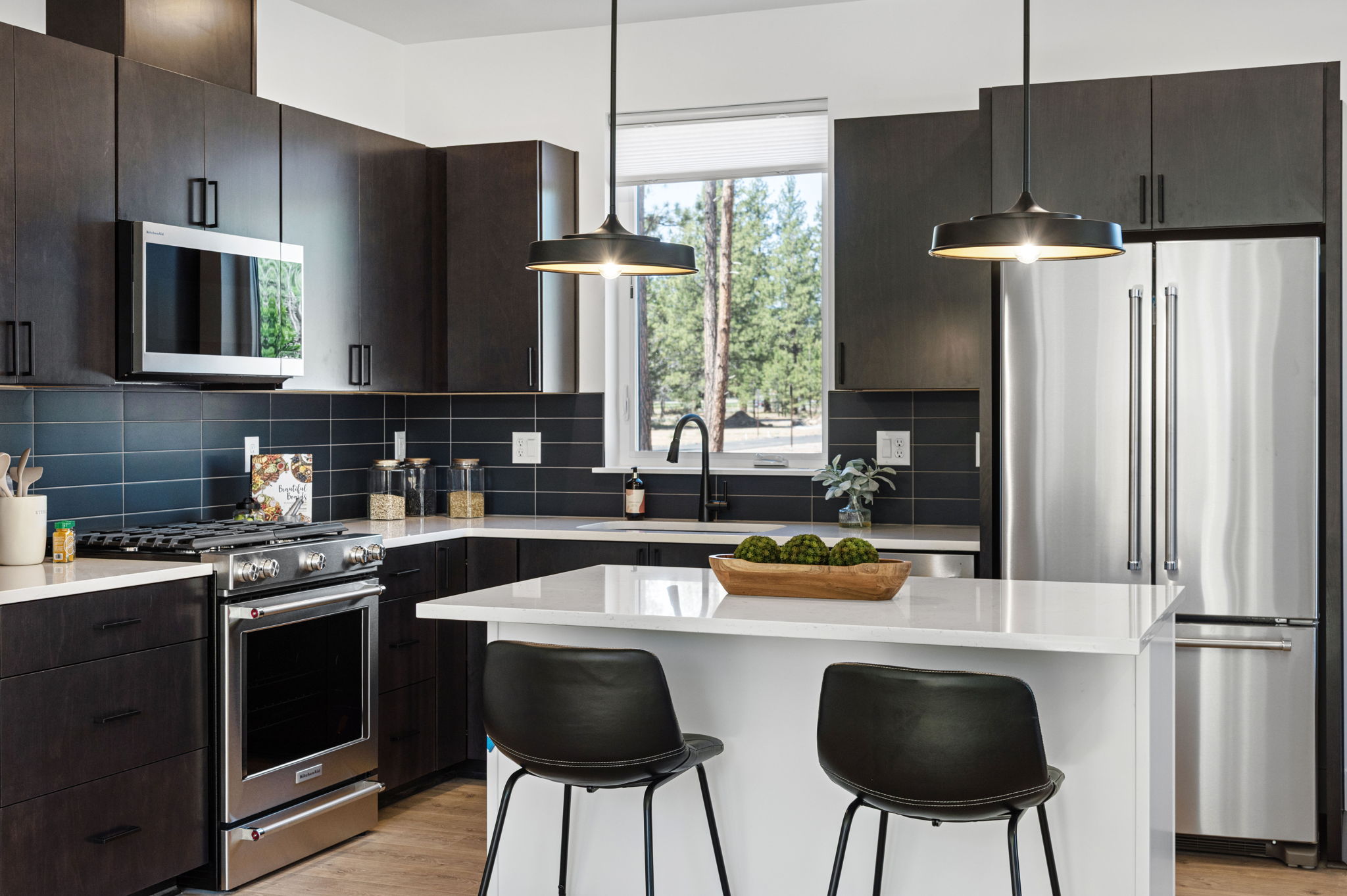 •The kitchen is equipped with modern, stainless steel appliances, ample cabinet space, and a large island, ideal for casual dining and entertaining.