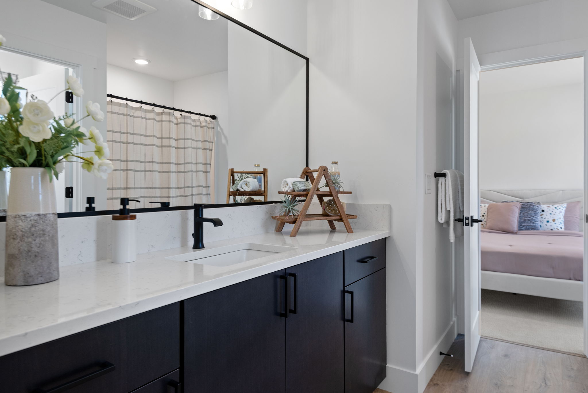 •These bedrooms share a common bathroom, which includes a bathtub/shower combination, a single vanity, and modern fixtures.