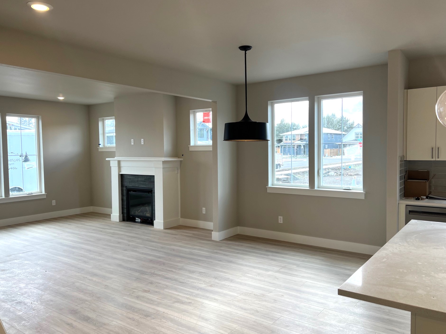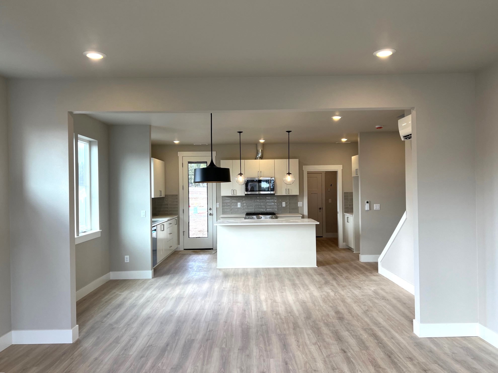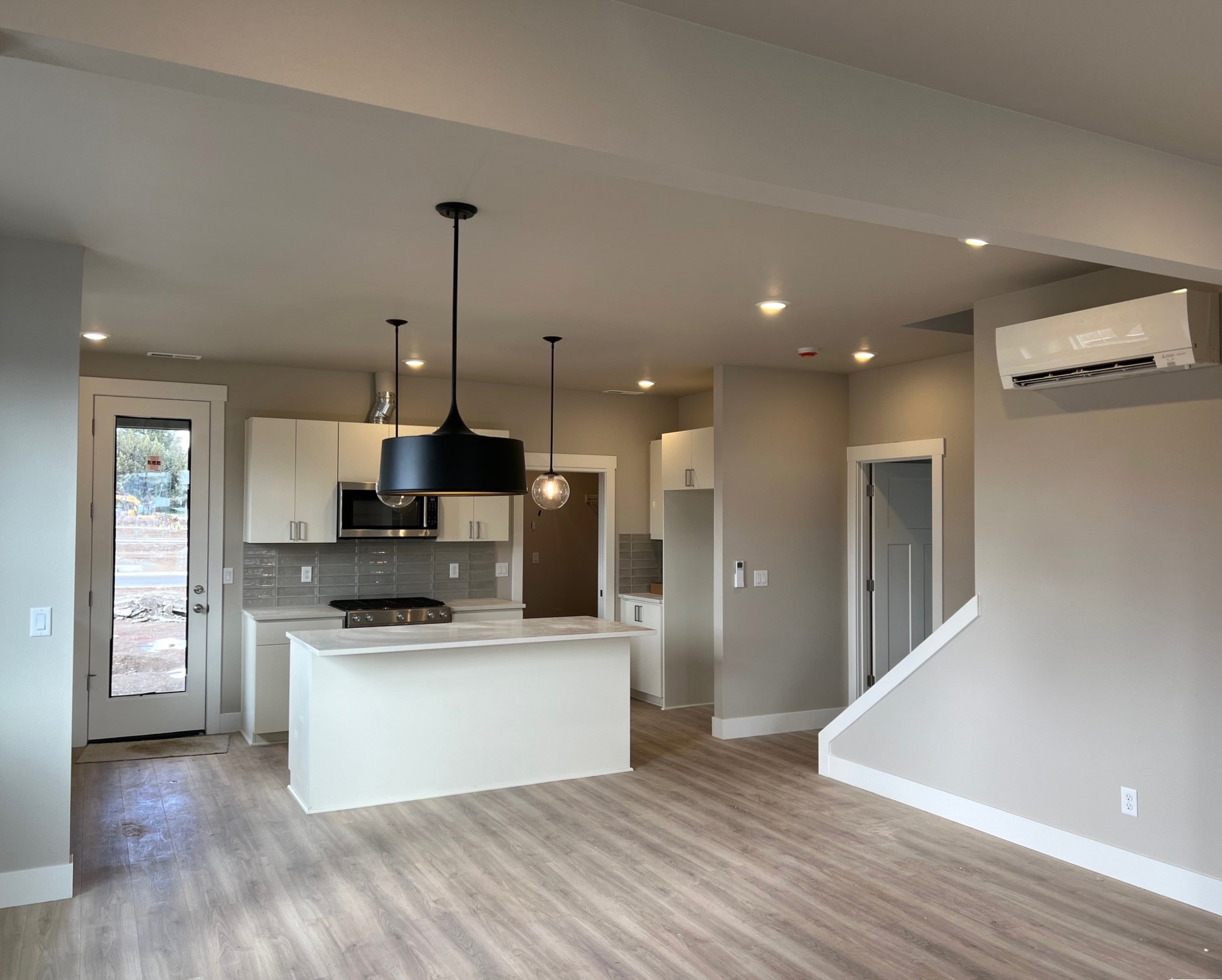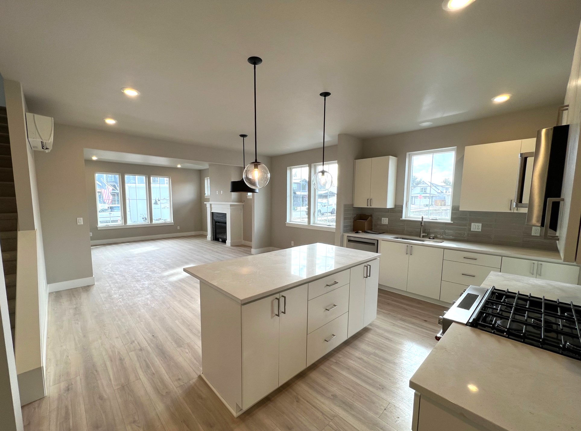 As you enter through the front door of this beautiful home you're welcomed into a bright, open great room with a gas fireplace, dining area and spacious kitchen. The main level also includes the primary bedroom suite, utility room and powder bath. Upstairs includes 2 additional bedrooms, full bath +loft area. The kitchen features solid surface counters, tile backsplash and stainless-steel appliances. Durable, modern, laminate floors throughout the main living area, bathrooms and utility room. Bathrooms feature solid surface counters and backsplash. Primary has dual vanity, tile shower & walk-in closet. The ductless heating system provides heating & cooling comfort year-round. This beautiful home includes a covered rear patio and an alley-load garage.