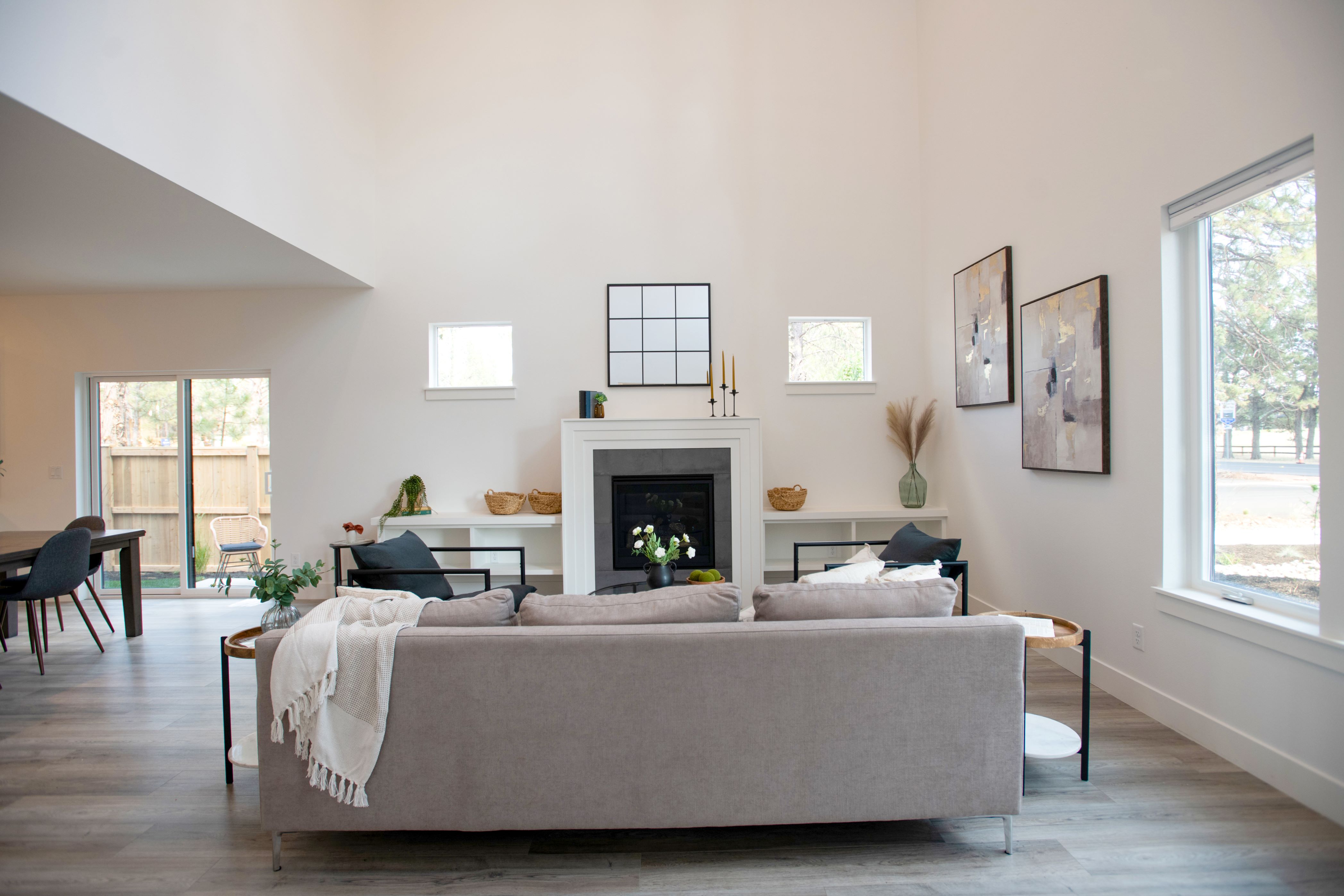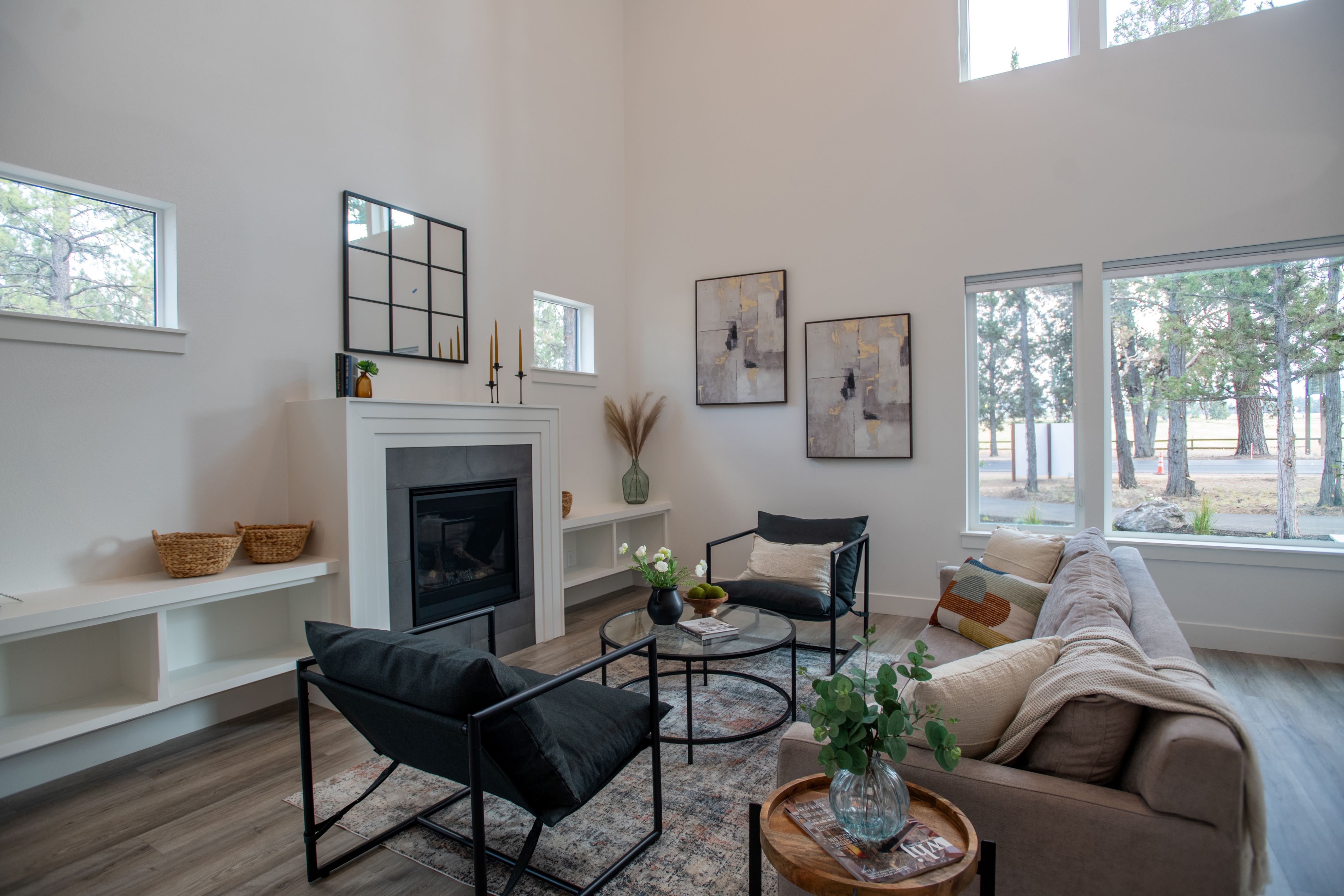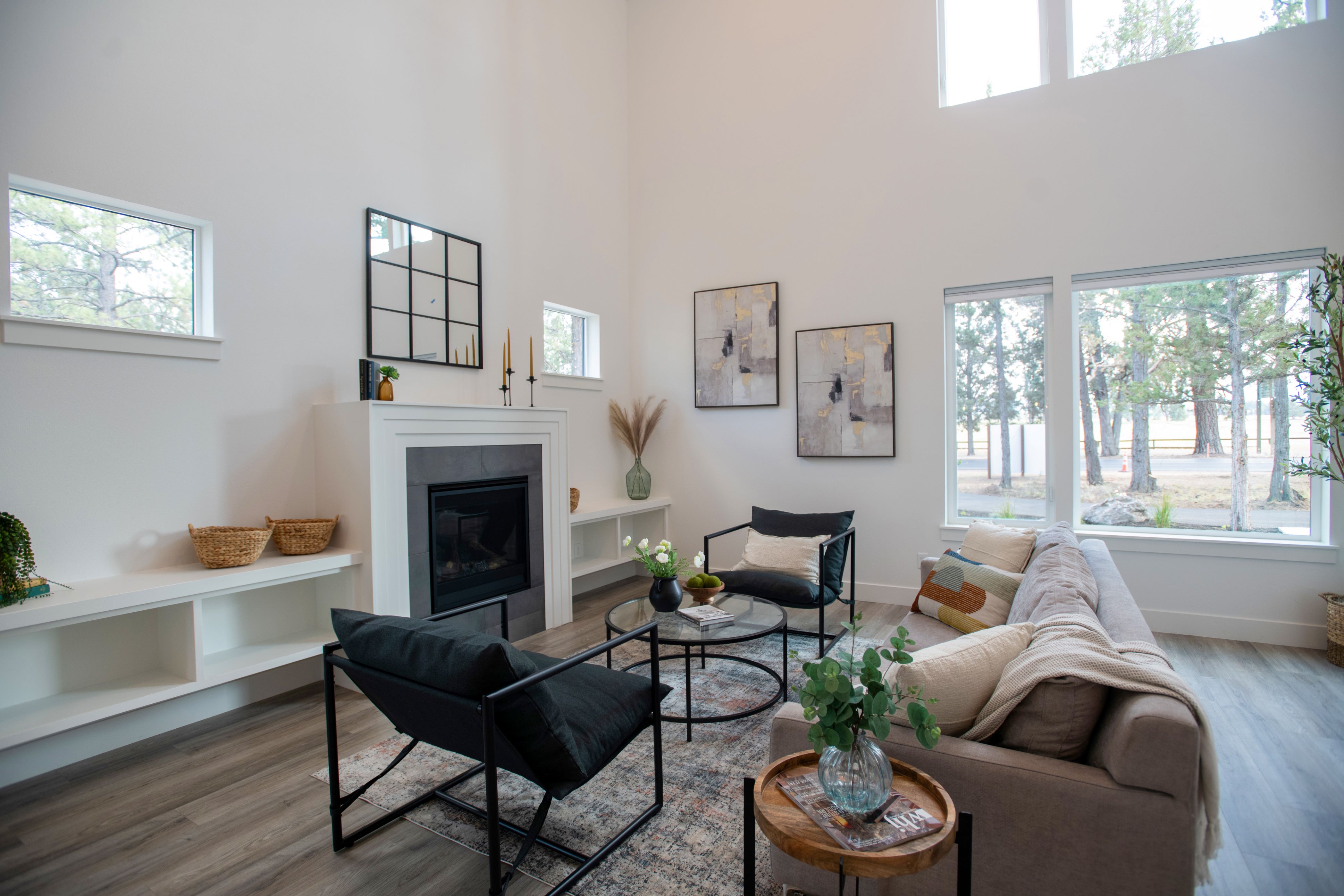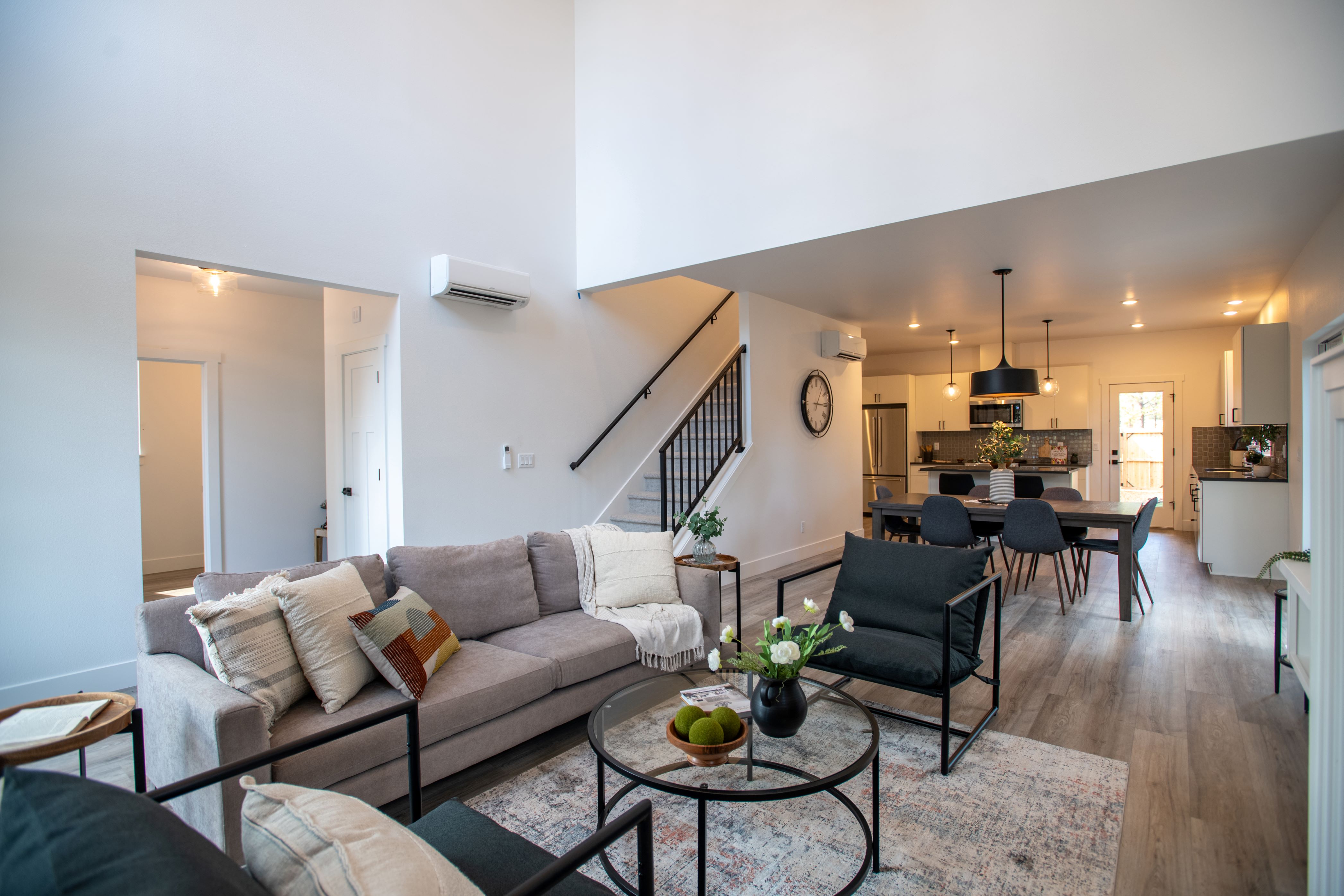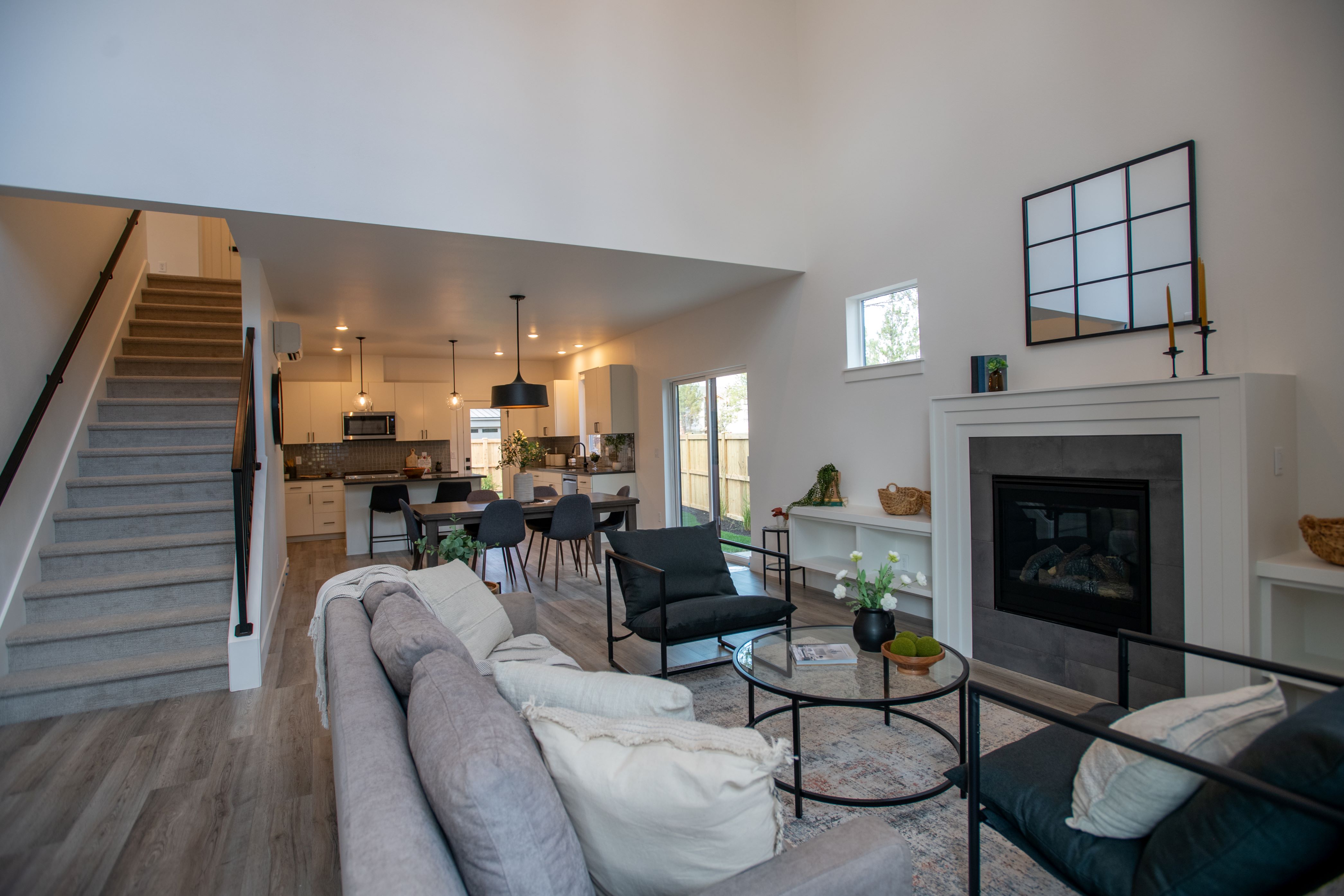•The ground floor of the Steelhead model features shared spaces such as a spacious, open-plan living room, dining area, and kitchen.