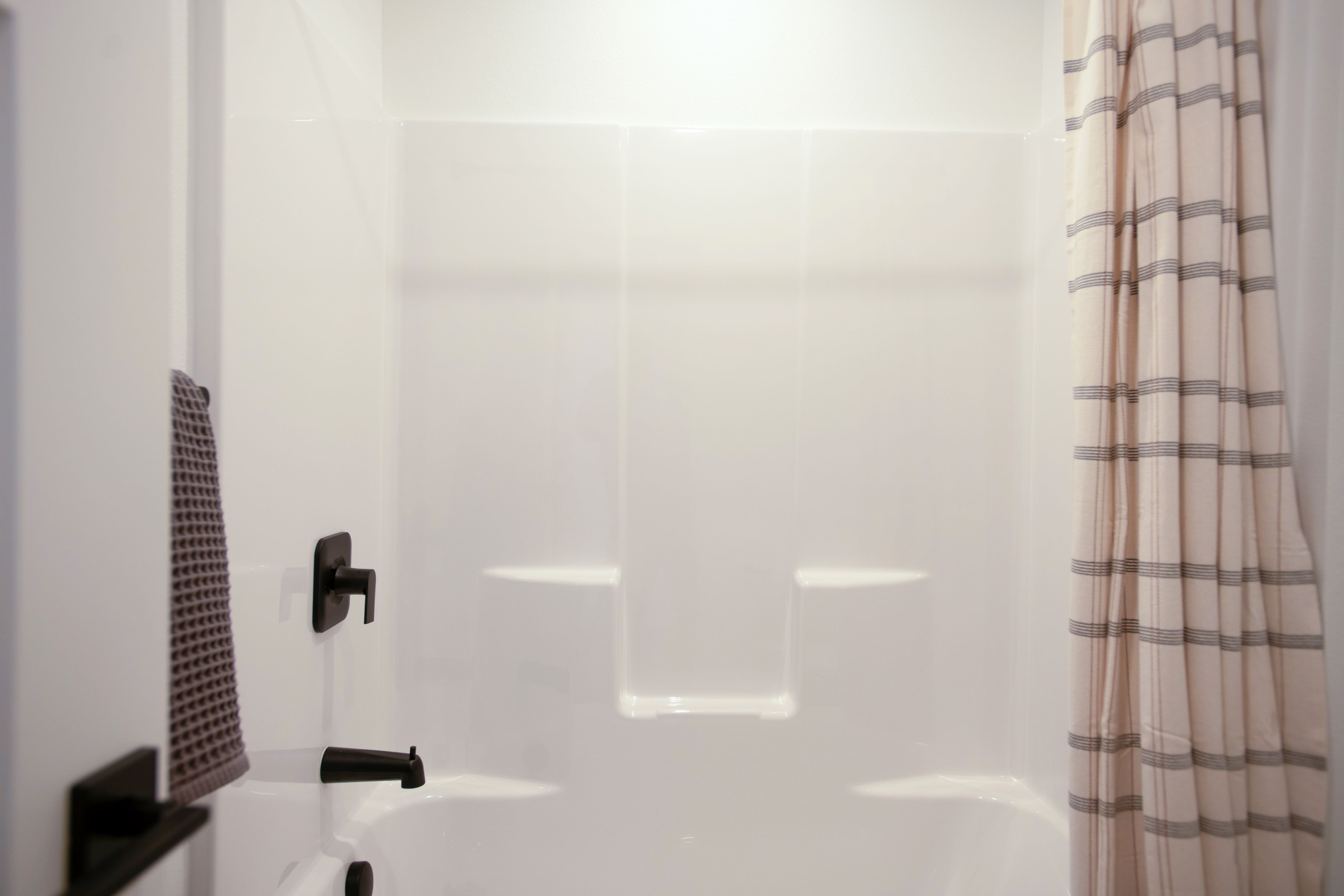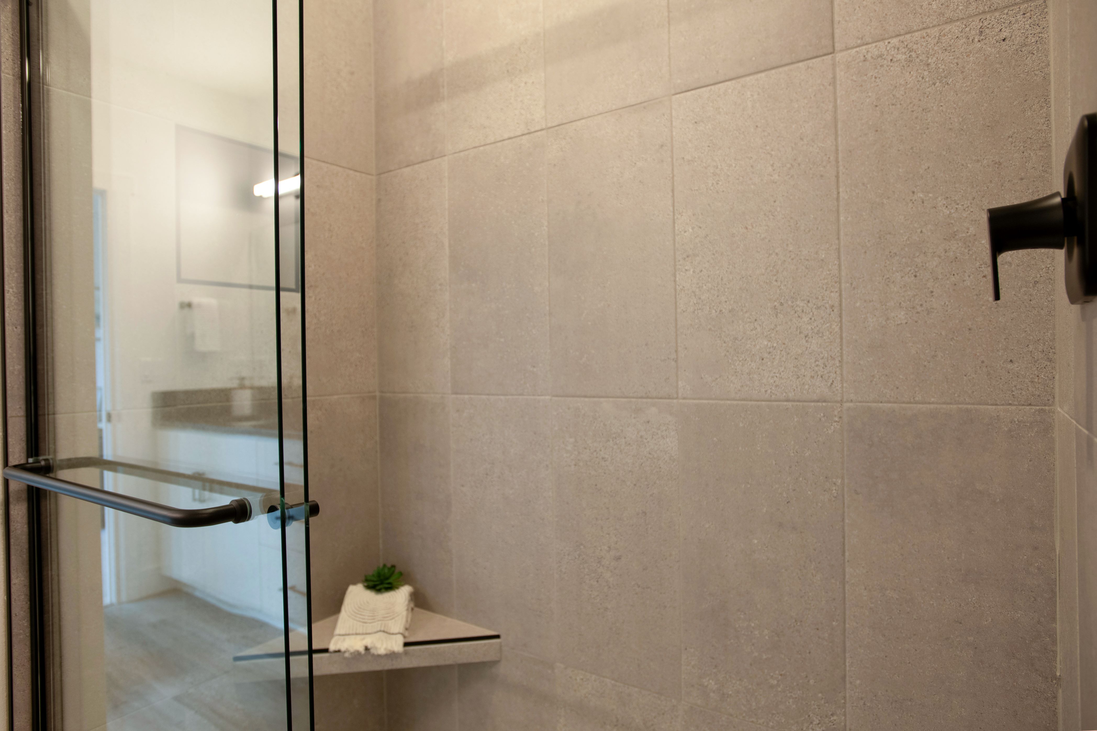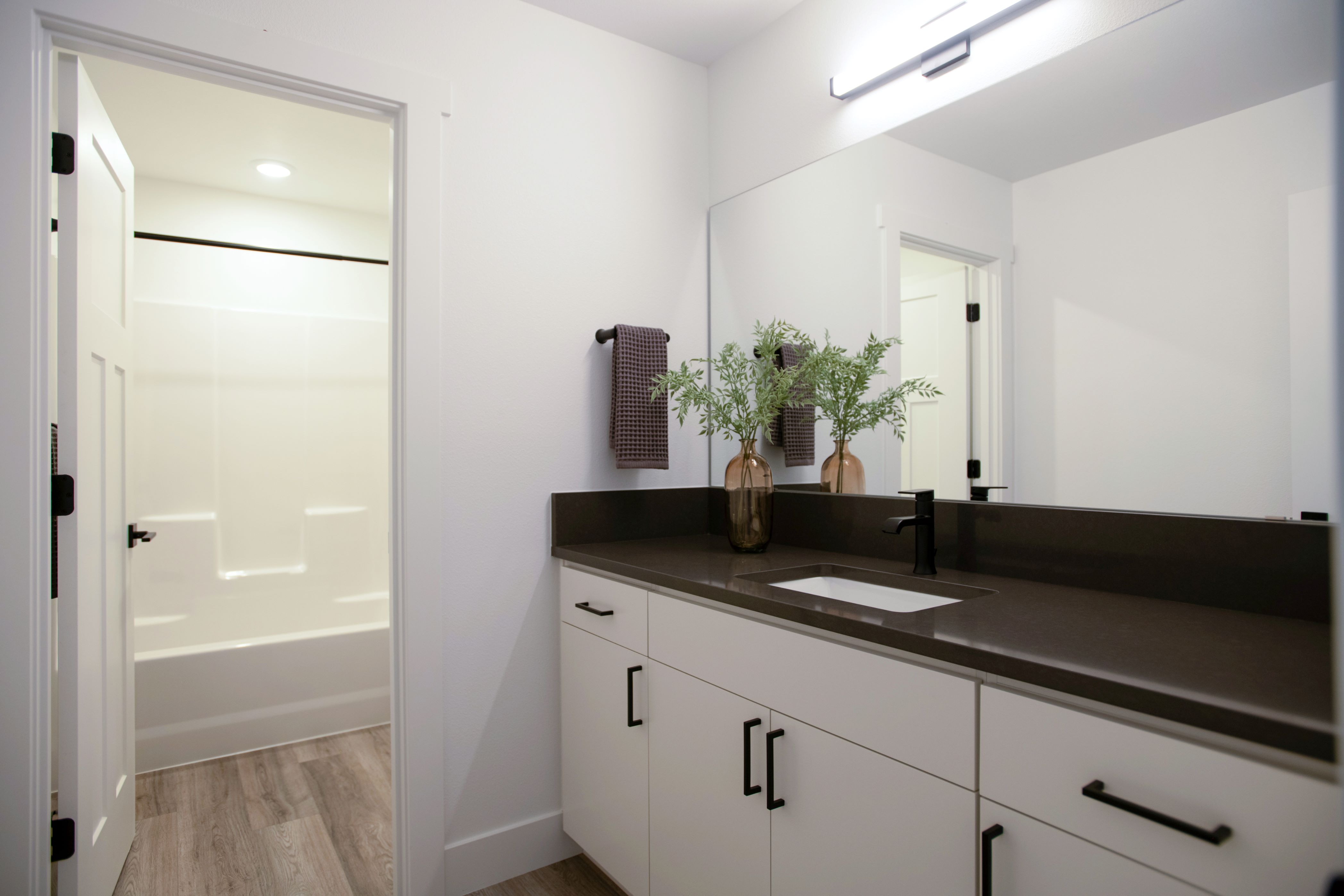 •The bedrooms share a common bathroom, which include a bathtub/shower combination, a single vanity, and modern fixtures.